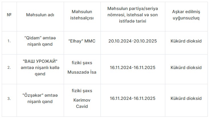 Uyğunsuzluq aşkarlanan qənd məhsulları və istehsalçıları ilə aşağıdakı cədvəldən tanış ola bilərsiniz: