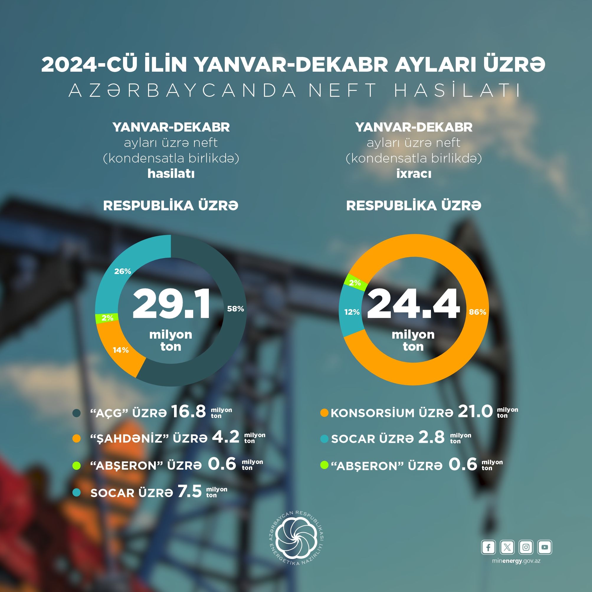 Energetika Nazirliyinin yaydığı məlumata görə, operativ məlumatlara əsasən, respublikada ötən il ərzində 29,1 milyon ton neft (kondensatla birlikdə) hasil edilib. Hasilatın 16,8 milyon tonu “Azəri-Çıraq-Günəşli”nin, 4,2 milyon tonu (kondensat) “Şahdəniz”in, 0,6 milyon tonu (kondensat) “Abşeron” yatağının payına düşüb. SOCAR üzrə neft (kondensatla birlikdə) hasilatı 7,5 milyon ton təşkil edib.