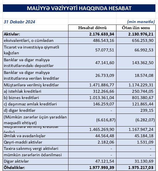 - Bankın kredit portfeli 25% artaraq 1,47 milyard manat təşkil edib.