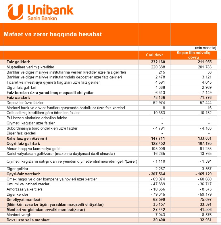 "Unibank" ASC 2024-cü ili 20 milyon 400 min manat xalis mənfəət ilə başa vurub. Bank 2023-cü ili 32 milyon 931 min manat xalis mənfəət ilə bağlamışdı. Ötən il "Unibank"ın xalis mənfəətinin azalması faiz, əməkhaqqı, inzibati və digər xərclərin artması ilə əlaqdar olub. Belə ki, keçən il "Unibank" gəlirlərini artırıb, lakin xərclərin daha çox artması mənfəətə azaldıcı təsir edib.
