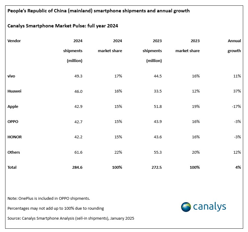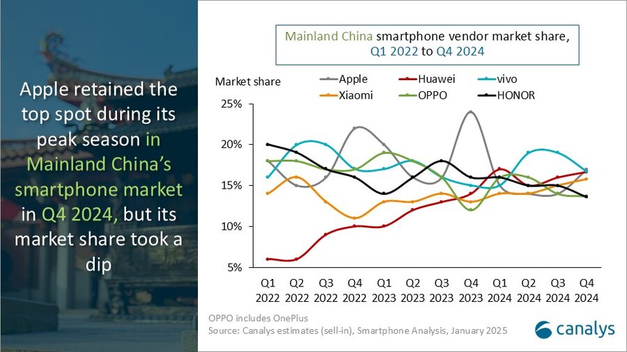 Apple 2024-cü ildə Çinin ən böyük smartfon satıcısı mövqeyini itirərək yerini yerli rəqibləri Vivo və Huawei-yə uduzub. "Canalys" araşdırma şirkətinin məlumatlarına görə, iPhone istehsalçısının Çində illik tədarükü 17 faiz azalıb. "Canalys"ın məlumatlarına görə, büdcə yönümlü Xiaomi Çinin ilk beş istehsalçısı arasında ən güclü artımı göstərib. Şirkət ilin son rübündə tədarüklərini 29 faiz artırıb. Oppo və Vivo müvafiq olaraq 18 faiz və 14 faiz artım qeyd ediblər. 2024-cü ildə Çində smartfon satışı 4 faiz artaraq 285 milyon ədədə çatıb.ABŞ-ın Apple şirkəti 2024-cü ildə "Çinin ən böyük smartfon satıcısı" titulunu itirərək yerini yerli rəqibləri Vivo və Huawei-yə uduzub. "Canalys" araşdırma şirkətinin məlumatlarına görə, iPhone telefonlarının istehsalçısı olan Apple-ın Çində illik satışı 17 faiz azalıb.