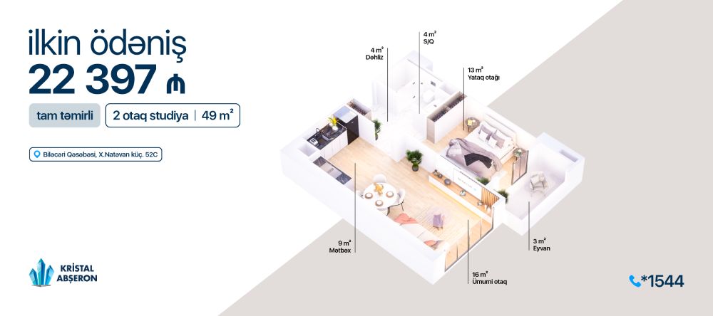 "Kristal Abşeron"un "Biləcəri" layihəsi həm yaşamaq, həm də investisiya üçün ideal seçimdir. Yaşamınızı yaşıllıqla əhatə olunmuş bir mühitdə qurmaq istəyirsinizsə *1544-ə zəng edə və ya satış ofisimizə yaxınlaşa bilərsiniz.
