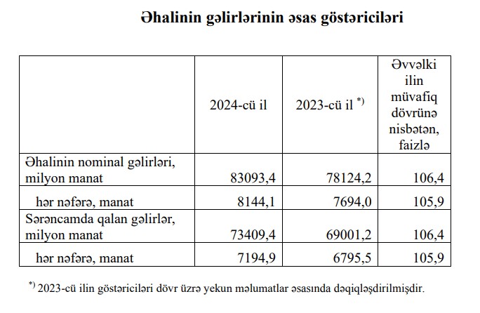 İlkin məlumatlara görə, 2024-cü ildə ölkə əhalisinin nominal gəlirləri əvvəlki ilə nisbətən 6,4 faiz artaraq 83 milyard 93,4 milyon manat və ya hər nəfərə orta hesabla 8144,1 manat olmuşdur.