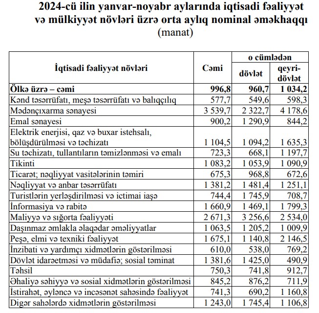 2024-cü ilin yanvar-noyabr aylarında ölkə iqtisadiyyatında muzdla çalışan işçilərin orta aylıq nominal əməkhaqqı 2023-cü ilin müvafiq dövrünə nisbətən 8 faiz artaraq 996,8 manat təşkil etmişdir. Əməkhaqqı neft-qaz sektorunda 3716,9 manat, qeyri neft-qaz sektorunda 946,9 manat təşkil etmişdir. Dövlət müəssisələrində çalışan işçilərin əməkhaqları 960,7 manat, özəl müəssisələrdə isə 1034,2 manat olmuşdur.