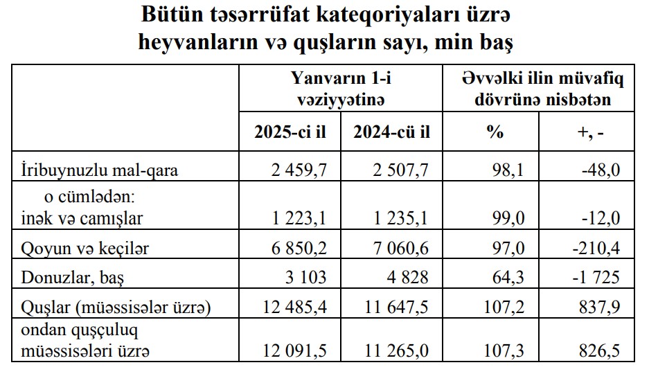 İlkin məlumatlara görə 2025-ci il yanvarın 1-i vəziyyətinə ölkə üzrə 6 milyon 850,2 min baş qoyun və keçi, 2 milyon 459,7 min baş iribuynuzlu mal-qara, o cümlədən 1 milyon 223,1 min baş inək və camış mövcud olmuşdur. İribuynuzlu mal-qaranın 49,7 faizini inək və camışlar təşkil edir. 2023-cü illə müqayisədə 20214-cü ildə iribuynuzlu mal-qaranın sayı 1,9% və ya 48 min baş, qoyun və keçilərin sayı isə 3% və ya 210,4 min baş azalıb.