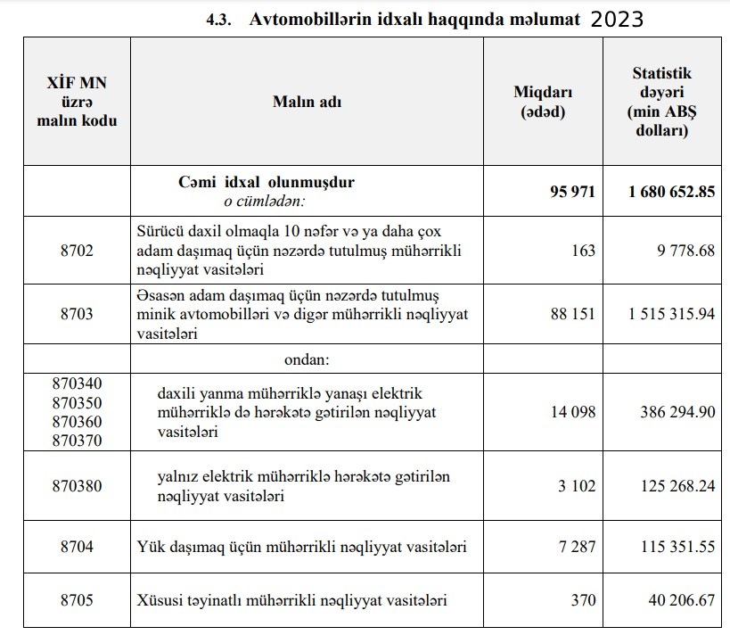 2023-cü ildə Azərbaycana 1 milyard 680 milyon 653 min dollar dəyərində 95 min 971 ədəd nəqliyyat vasitəsi idxal olunmuşdu.