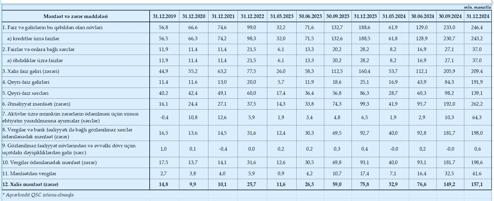 Azərbaycandakı bank olmayan kredit təşkilatları (BOKT) 2024-cü ili 157,1 milyon manat xalis mənfəətlə başa vurub.