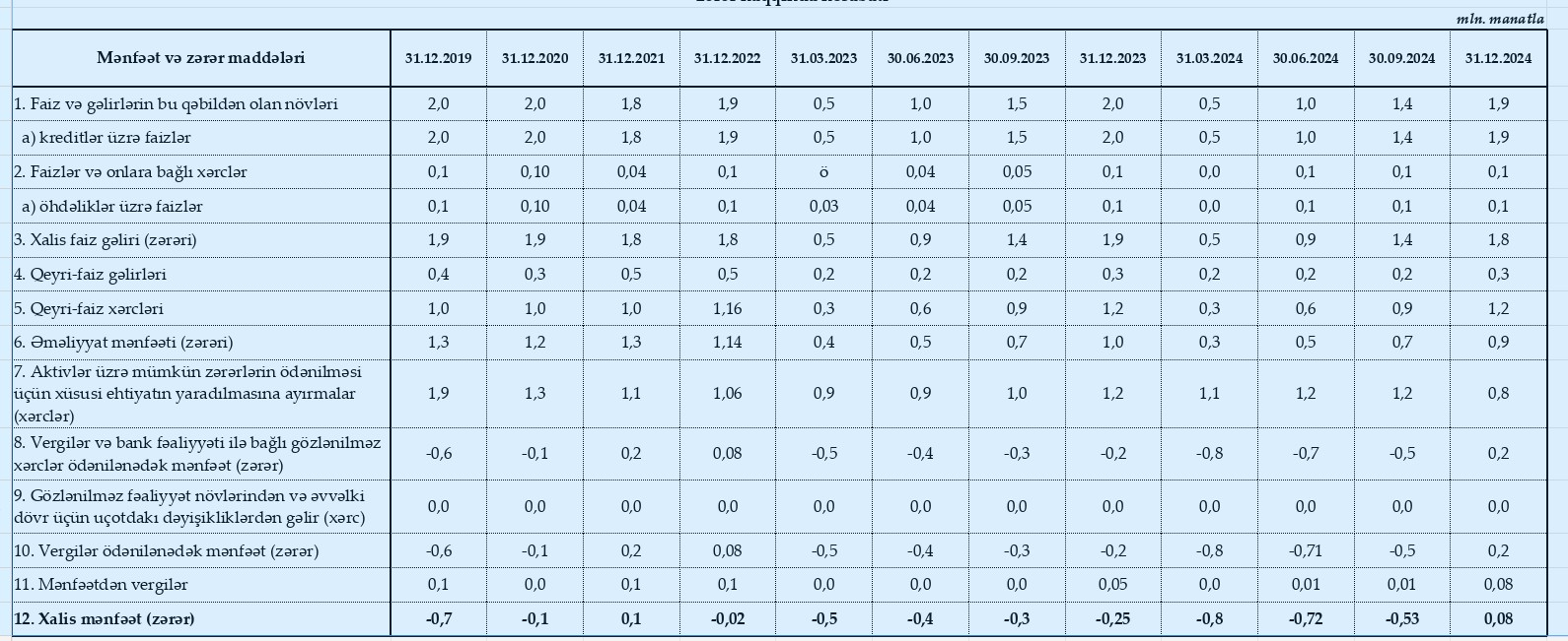 Azərbaycandakı kredit ittifaqları 2024-cü ili 0,1 milyon manat xalis mənfəətlə başa vurub. Halbuki, kredit ittifaqları 2023-cü ildən 0,25 milyon manat xalis zərərlə çıxmışdı.