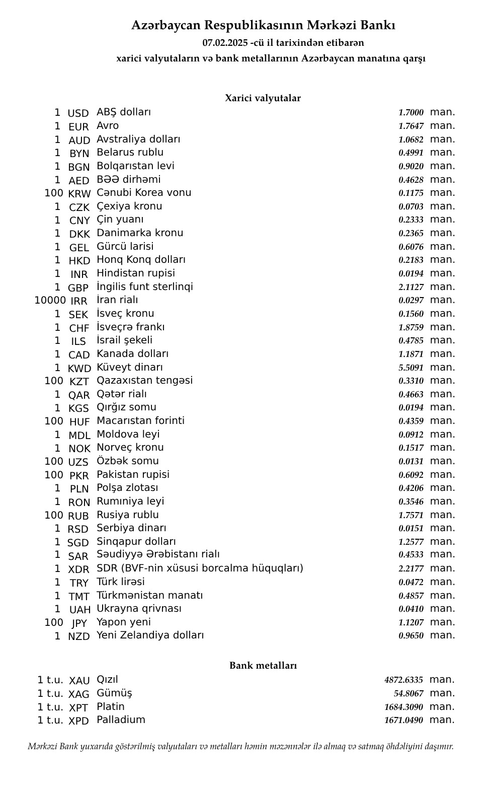Rəsmi məzənnələr açıqlandı