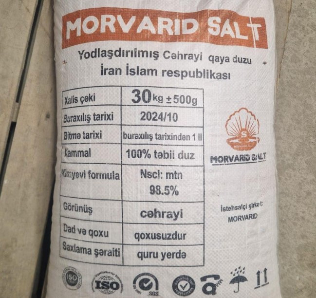 Marja.az Agentliyin məlumatına istinadən xəbər verir ki, fiziki şəxs Mənsimov Məmməd Adil oğlunun İrandan idxal etdiyi “Behnam Kar Azar Bilasavar Co” şirkətinin istehsalı olan “Morvarid” əmtəə nişanlı çəhrayı duzun Sabirabad şəhəri, Vidadi küçəsi 8A ünvanında yerləşən qablaşdırılma müəssisəsində “İlğım” əmtəə nişanı ilə “Himalay duzu” adı altında qablaşdırılaraq satışa çıxarıldığı aşkarlanıb. Həmçinin məhsulun etiketində tərkibinə yodun qatılması ilə bağlı hər hansı məlumatın qeyd edilmədiyi müəyyən olunub.