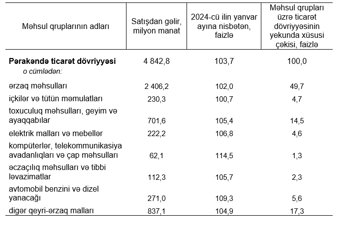 2025-ci ilin yanvar ayında alıcıların pərakəndə ticarət şəbəkəsində aldıqları mallara xərclədiyi vəsaitin 49,7 faizi ərzaq məhsullarının, 4,7 faizi içkilər və tütün məmulatlarının, 14,5 faizi toxuculuq məhsulları, geyim və ayaqqabıların, 5,6 faizi avtomobil benzini və dizel yanacağının, 4,6 faizi elektrik malları və mebellərin, 2,3 faizi əczaçılıq məhsulları və tibbi ləvazimatların, 1,3 faizi kompüterlər, telekommunikasiya avadanlıqları və çap məhsullarının, 17,3 faizi isə digər qeyri-ərzaq mallarının alınmasına sərf olunmuşdur.