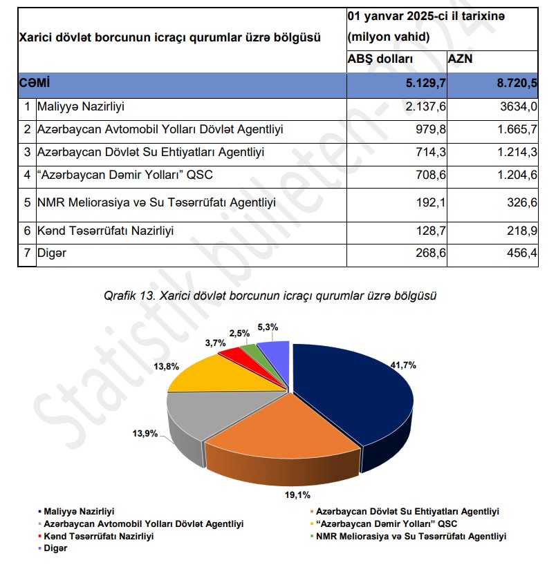 Aşağıdakı cədvəldə 1 yanvar 2025-ci il tarixinə dövlət qurumlarının cəlb etdiyi xarici borcun məbləğləri verilib: