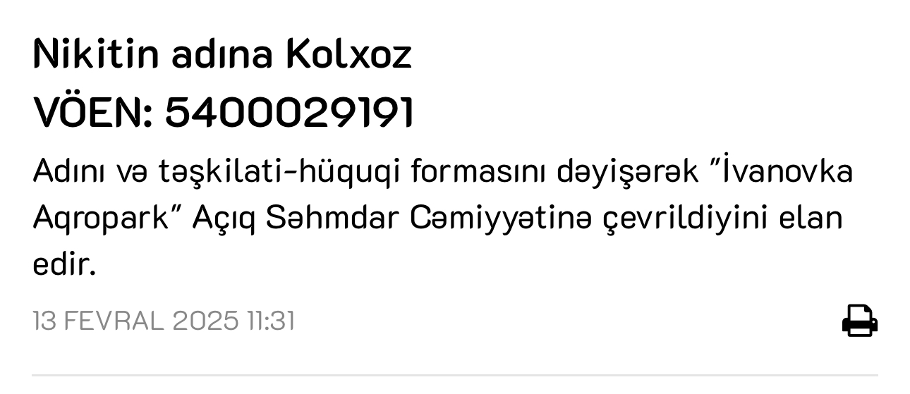 İsmayıllı rayonunun İvanovka kəndində fəaliyyət göstərən Nikitin adına kolxoz adını və təşkilati-hüquqi formasını dəyişərək "İvanovka Aqropark" ASC-yə çevrildiyini elan edib.