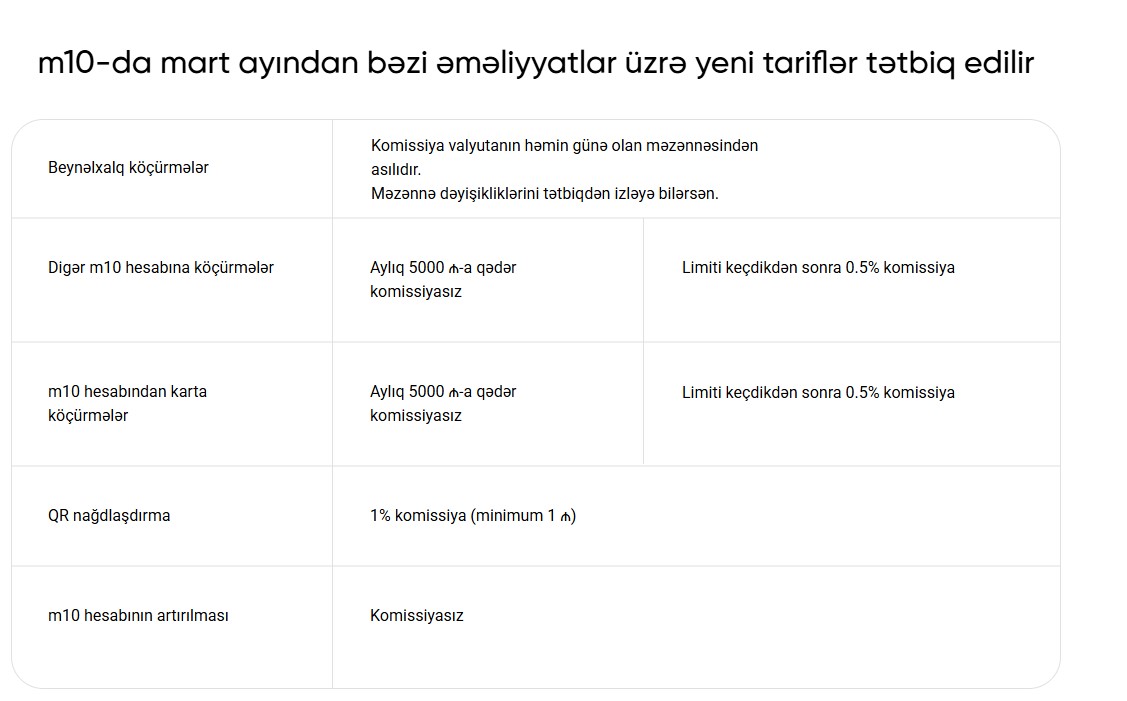 Həmçinin, hazırda m10 hesabından karta köçürmələr komissiyasızdır. Mart ayından etibarən aylıq cəmi 5 min manata qədər köçürmələr komissiyasız olacaqdır. Limiti keçdikdən sonra 0.5% komissiya tutulacaqdır.