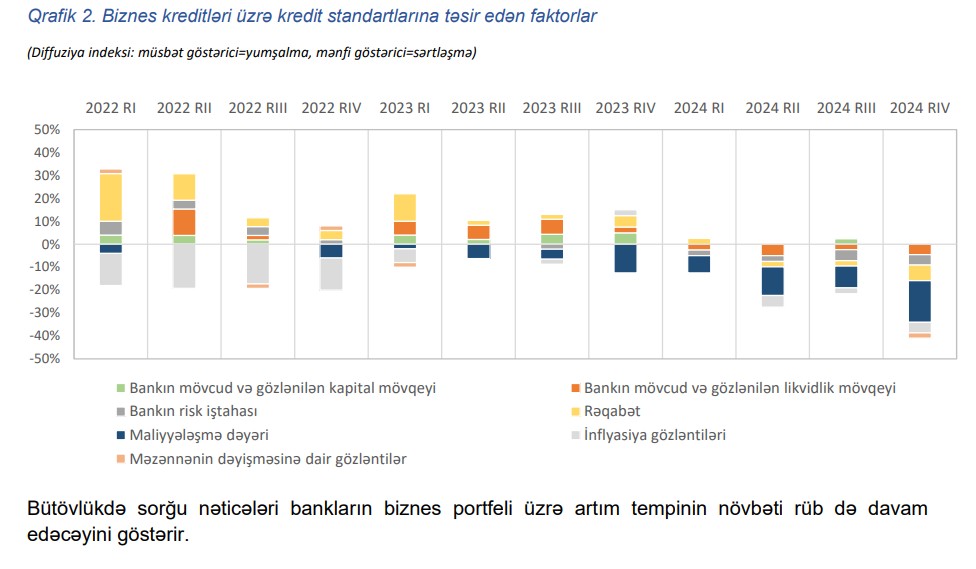 2024-cü ilin IV rübü üzrə sorğu nəticələrinə əsasən, mikro və iri sahibkarlıq subyektlərinə verilən kreditlər üzrə standartlarda dəyişiklik olmasa da, KOS (kiçik və orta sahibkarlıq) subyektləri üzrə kredit standartlarında sərtləşmə müşahidə edililib. Banklar növbəti rübdə ümumi biznes kreditləri, o cümlədən mikro və iri sahibkarlıq subyektləri üzrə kredit standartlarında dəyişiklik olmayacağı, KOS subyektləri üzrə isə standartlarda sərtləşmənin davam edəcəyi qənaətindədirlər. Banklar biznes kreditləri üzrə standartlarda dəyişikliklərin əsasən yuxarı riskli kreditlərə tətbiq olunan marja və kreditlərin maya dəyərinin artımı formasında olduğunu qeyd ediblər.