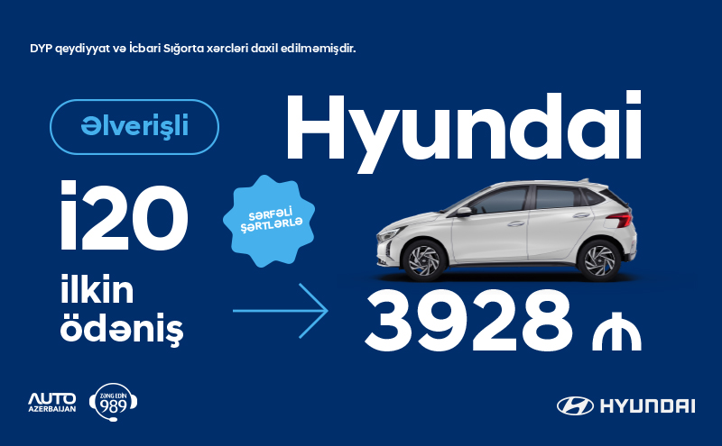 Qeyd: Hyundai i20 və Venue modellərinin ilkin ödənişində DYP və İcbari Sığorta, Hyundai Elantra modelində DYP qeydiyyat xərcləri nəzərə alınmamışdır.