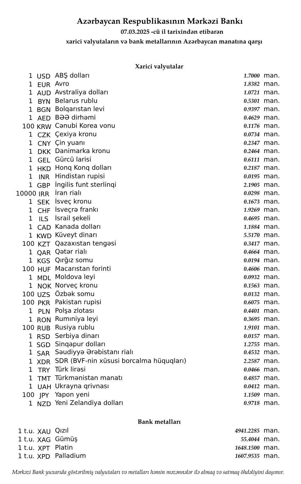 Dolların bazar ertəsi üçün rəsmi məzənnəsi müəyyən olunub