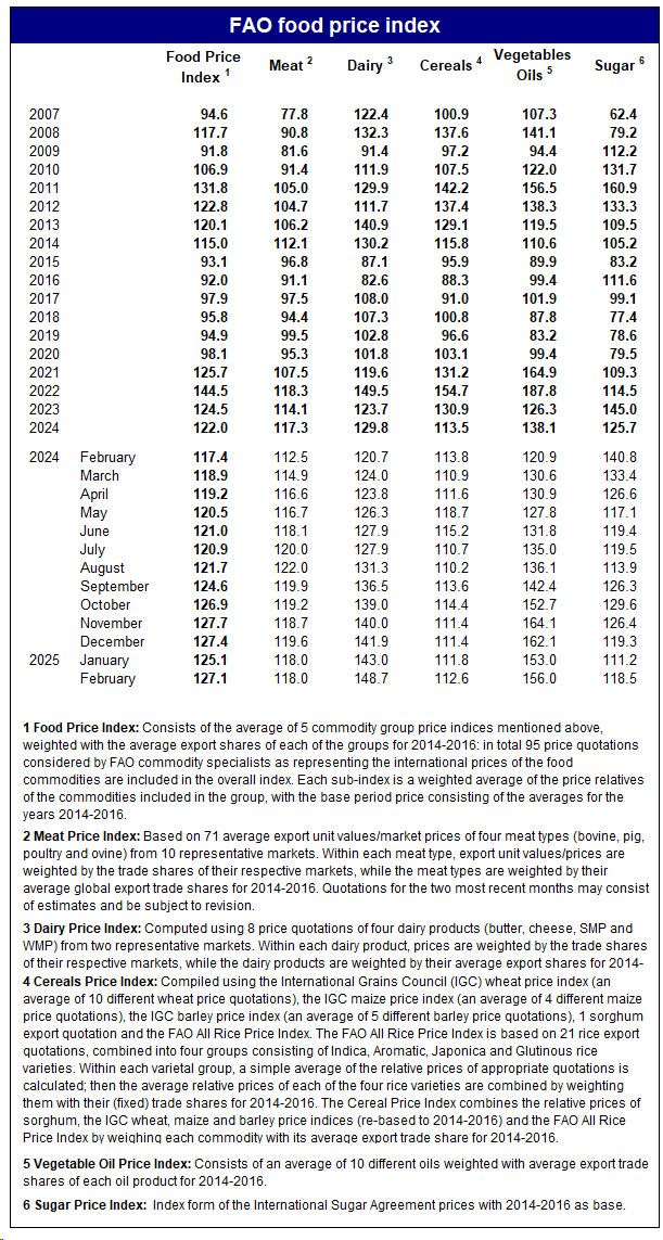 Marja.az FAO-nun yaydığı açıqlamaya istinadən xəbər verir ki, ərzaq məhsullarının beynəlxalq qiymətlərində aylıq dəyişiklikləri izləyən FAO-nun Ərzaq Qiymətləri İndeksi fevralda yanvar ayı ilə müqayisədə 1,6 faiz artaraq orta hesabla 127,1 bənd təşkil edib. Ötən ilin fevral ayı ilə müqayisədə artım tempi 8,2 faiz təşkil edib.