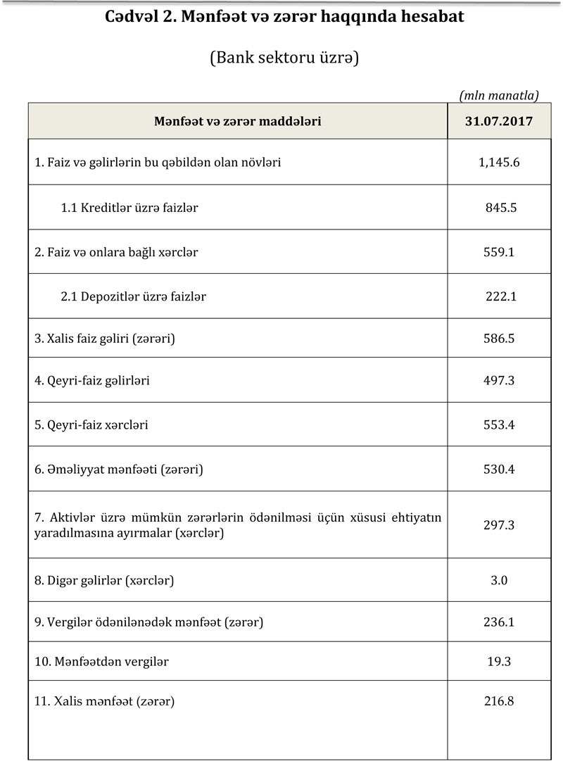 2017-ci ilin31 iyul tarixinə olan bank sektorunun əsas göstəriciləri bank sektorunun icmal göstəricilərində öz əksini tapmışdır.