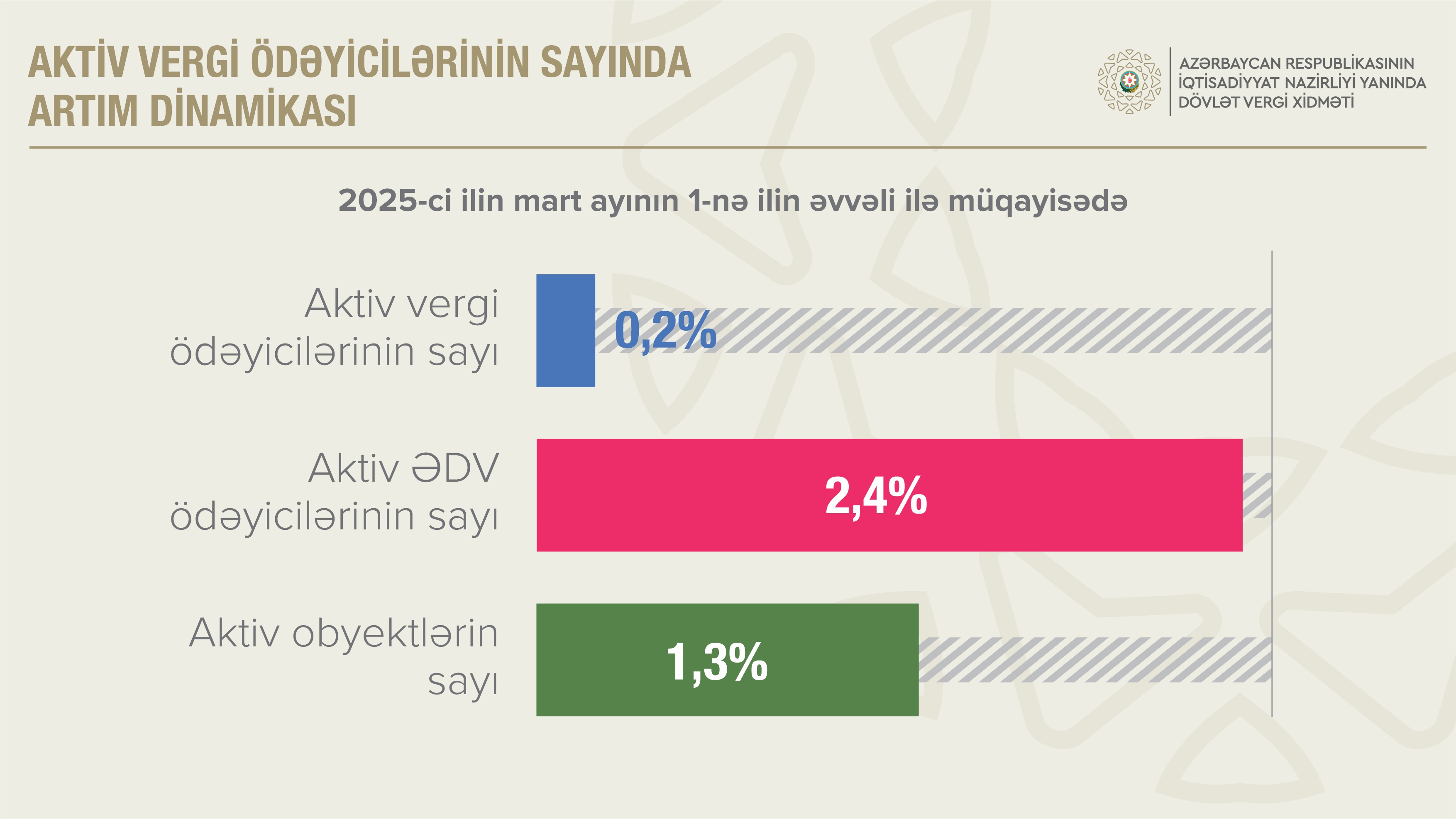 1 mart 2025-ci il tarixə aktiv vergi ödəyicilərinin sayı ilin əvvəli ilə müqayisədə 0,2 faiz artaraq 808,4 min, aktiv ƏDV ödəyicilərinin sayı isə 2,4 faiz artaraq 54,1 min təşkil edib.