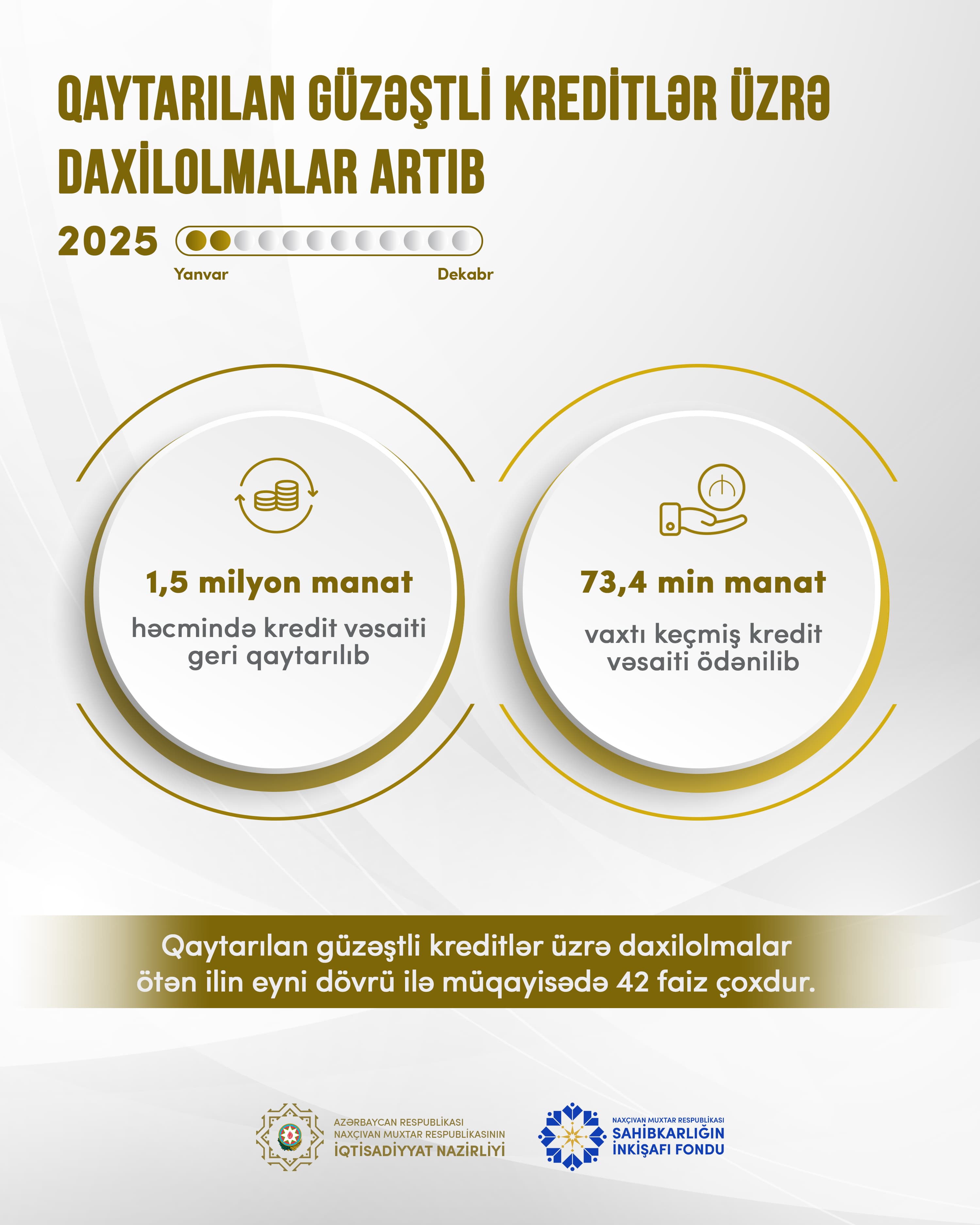 Bu ilin 2 ayı ərzində verilən güzəştli kreditlərin 1,5 milyon manatının geri qaytarılması təmin edilib ki, bu da ötən ilin eyni dövrü ilə müqayisədə 42 faiz çoxdur.