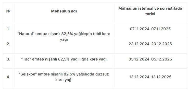 Uyğunsuzluq aşkarlanan məhsul partiyaları aşağıdakılardır: