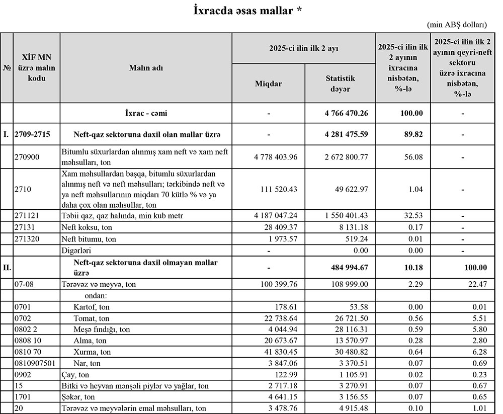 2025-ci ilin yanvar-fevral aylarında (ilk 2 ayda) Azərbaycanın ən çox ixrac və idxal etdiyi mallar.