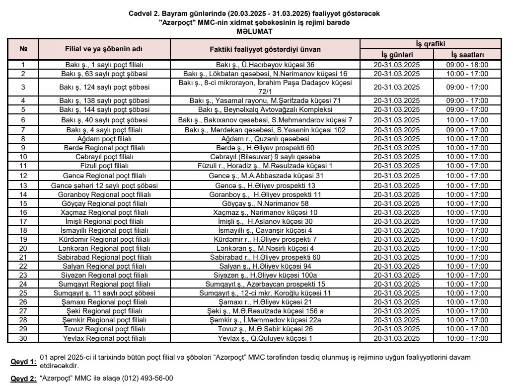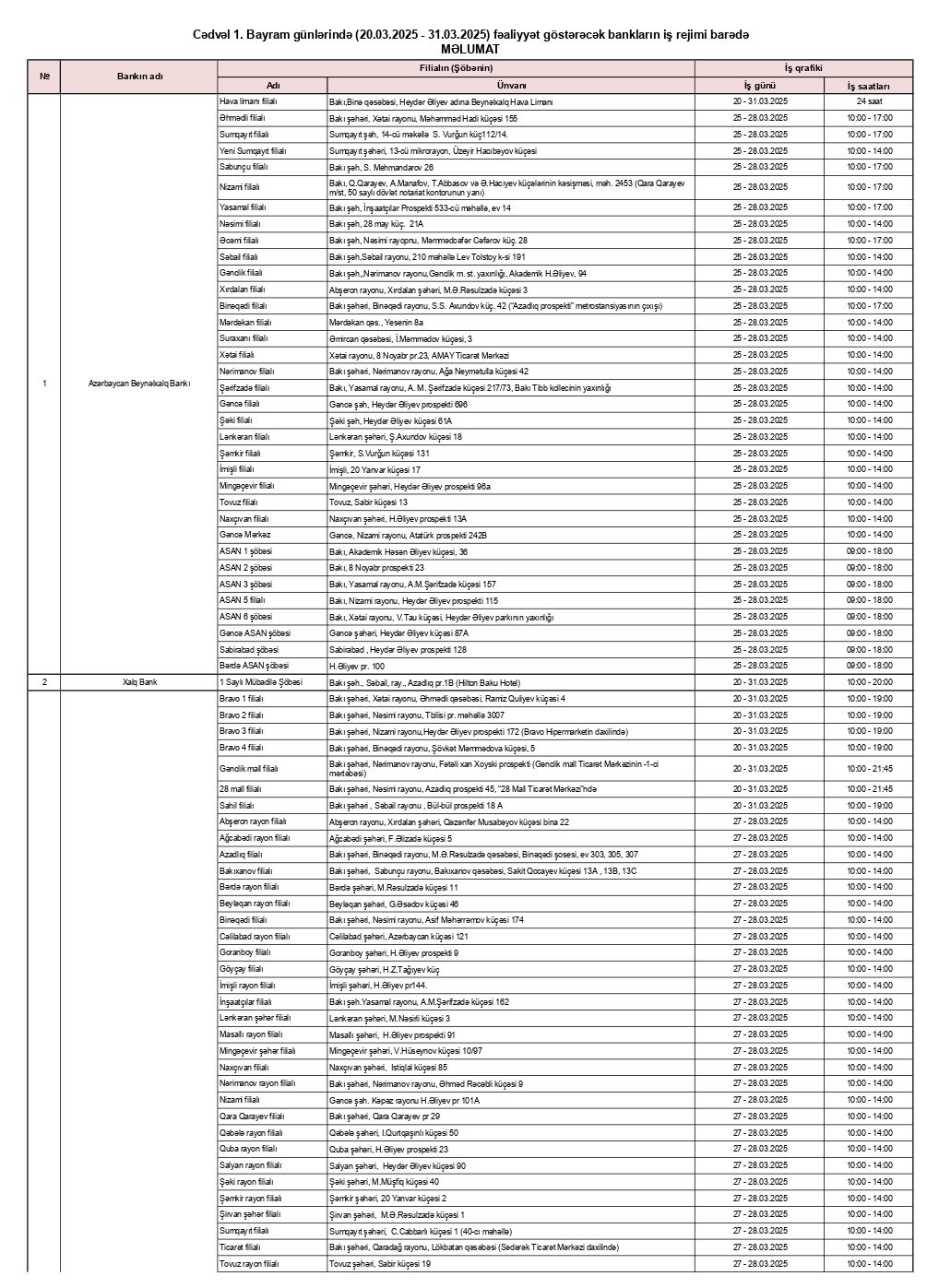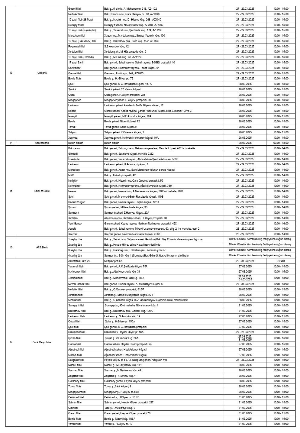 Bayram günlərində 17 bankın 212 satış nöqtəsi müştərilərə xidmət göstərəcək.20 – 31 mart 2025–ci tarixləri olan qeyri-iş günlərində bankların və “Azərpoçt” MMC-nin bəzi filial və şöbələri, habelə valyuta mübadilə məntəqələri fəaliyyət göstərəcəklər.