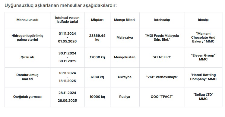 Uyğunsuzluq aşkarlanan məhsullar aşağıdakılardır: