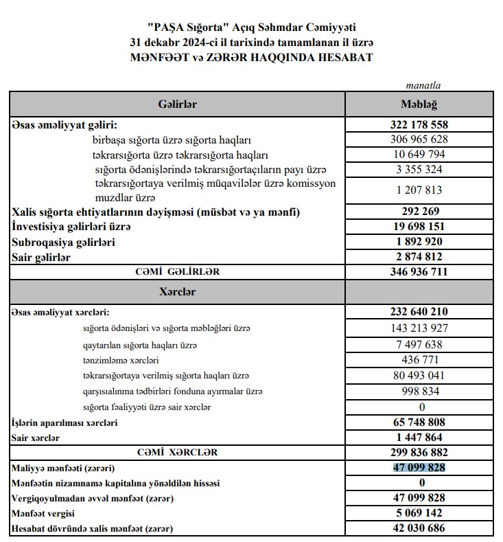 "PAŞA Sığorta" ASC 2024-cü ili 42 milyon 31 min manat xalis mənfəət ilə başa vurub. Şirkət 2023-cü ili 35 milyon 489 min manat xalis mənfəət ilə bağlamışdı. Beləliklə, "PAŞA Sığorta"nın xalis mənfəəti 2024-cü ildə 2023-cü illə müqayisədə 6 milyon 542 min manat və ya 18,4% artıb.