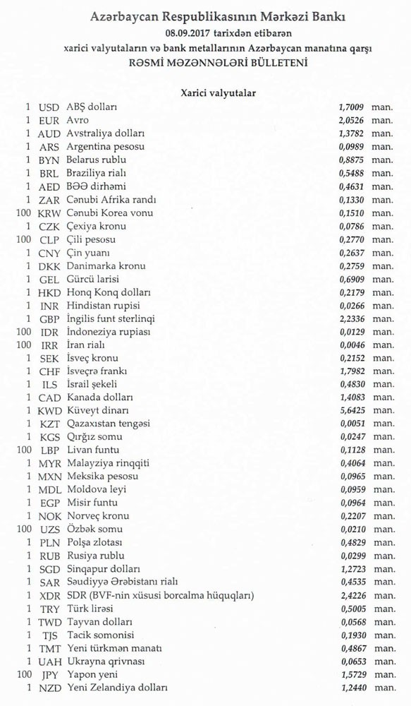 Sentyabrın 7-də rəsmi olaraq 1 dollar 1,7009 manata, 1 avro isə  2.0283 manata bərabər idi.