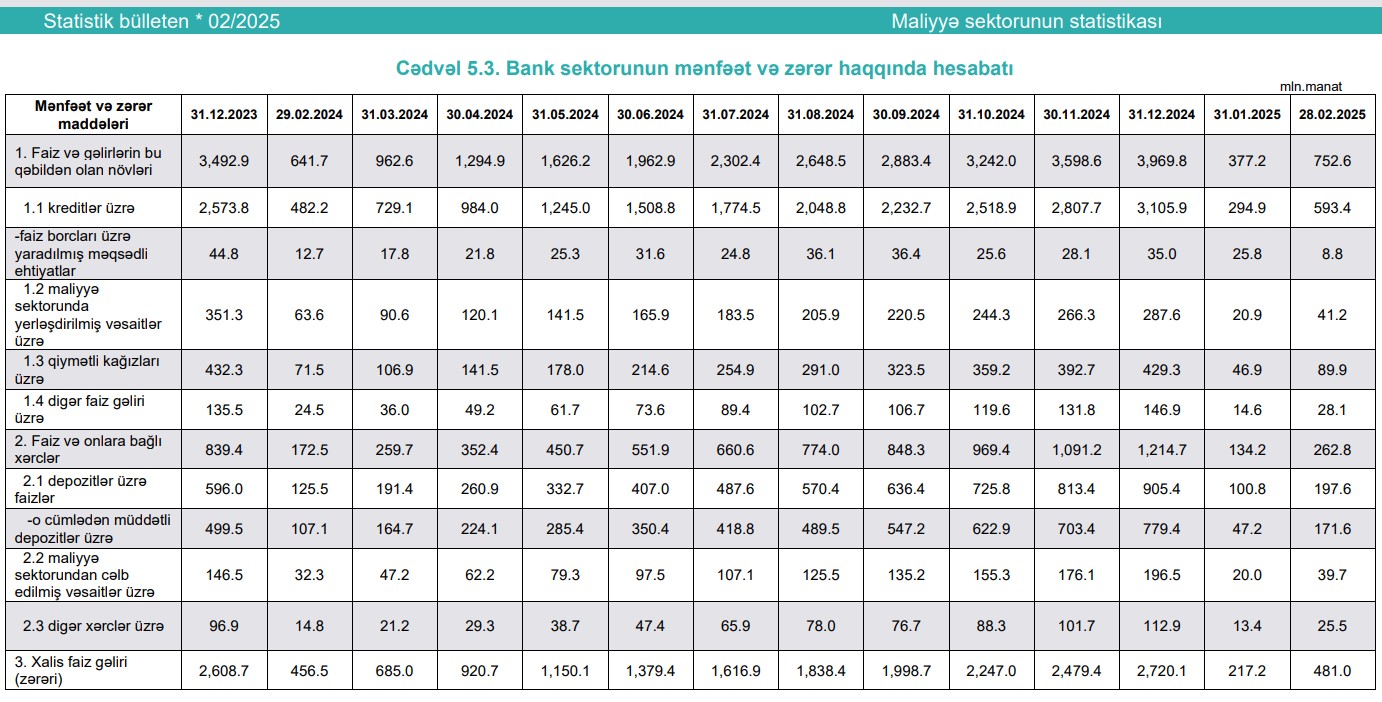2025-ci ilin yanvar- fevral aylarında banklar 179.4 milyon manat xalis mənfəət, 275.2 milyon manat məbləğində əməliyyat mənfəəti əldə ediblər.