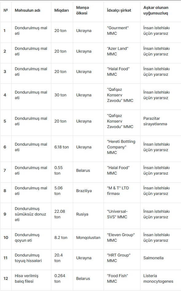 Marja.az xəbər verir ki, uyğunsuzluq Ukrayna, Belarus və Braziliyadan idxal olunan dondurulmuş mal ətində, Rusiyadan idxal olunan dondurulmuş sümüksüz donuz ətində, Monqolustandan idxal olunan dondurulmuş qoyun ətində, Ukraynadan idxal olunan dondurulmuş toyuq hissələrində və Belarusdan idxal olunan hisə verilmiş balıq filesində aşkar olunub.