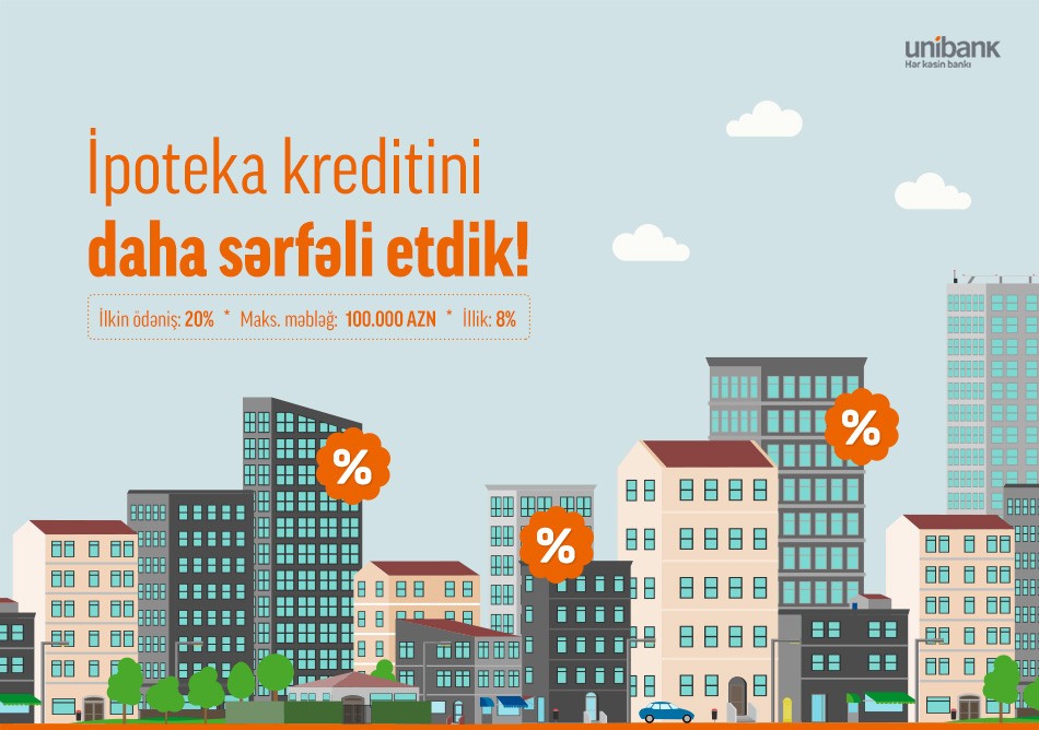 İndi Unibank-da ipoteka kreditləri daha da sərfəli olub. Mənzil sahibi olmaq istəyənlər, evin ilkin ödənişinin 20% -ni etməklə, 100 min manatadək ipoteka krediti götürə bilərlər.
