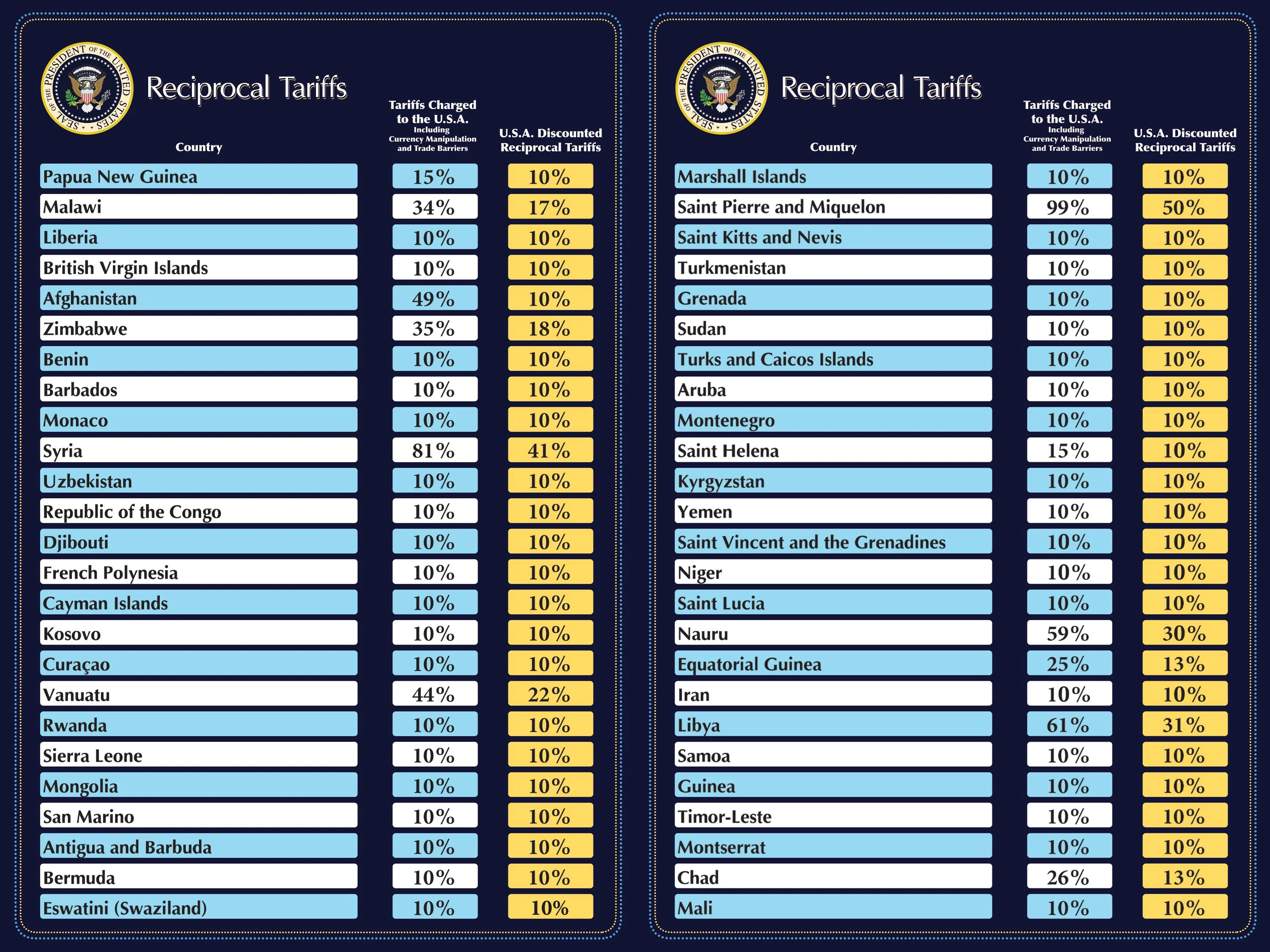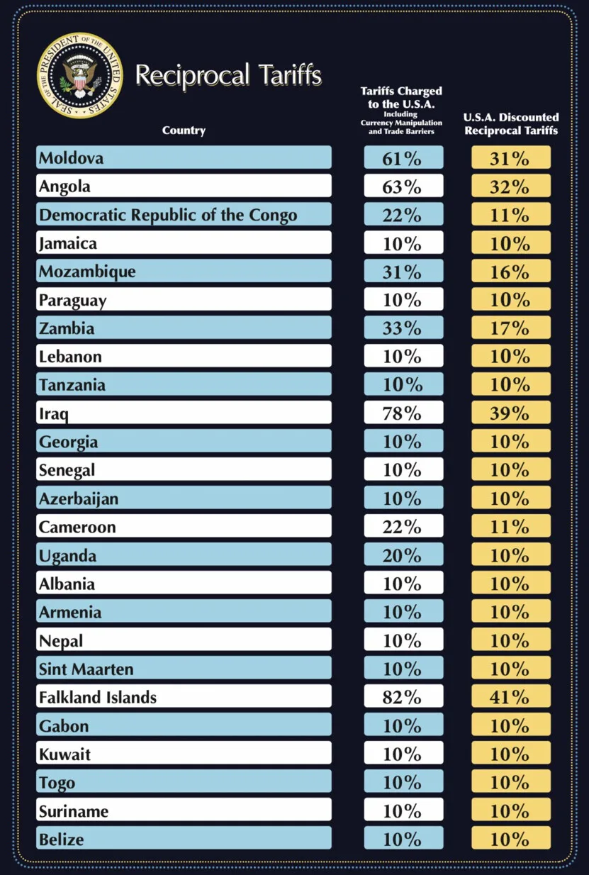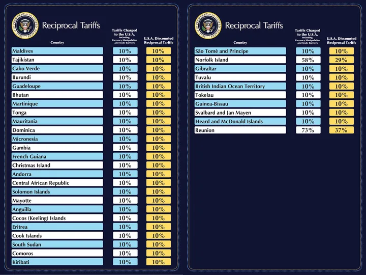 Dərc edilən siyahıya görə ən yüksək tarif Lesotoya (50%), Kambocaya (49%), Laosa (48%), Madaqasqara (48%), Vyetnama (46%), Şri-Lankaya (44%) və Myanmara (44%) tətbiq edilir.