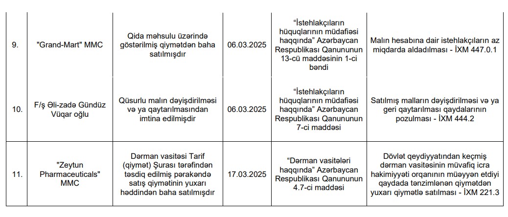 Belə ki, fiziki şəxs İbrahimova Vüsalə Vaqif qızı, “Azerbaijan Technologies” Firması, F/ş Əfəndiyev Əmrah Camaldin oğlu, Araz Supermarket” MMC, “Azərbaycan Supermarket" MMC (Bravo brendi), “Bazarstore” MMC, “ANC Group" MMC (Rahat Market), “Embawood” MMC, "Grand-Mart" MMC, fiziki şəxs Əli-zadə Gündüz Vüqar oğlu və "Zeytun Pharmaceuticals" MMC barəsində inzibati xəta haqqında protokol tərtib edilib.