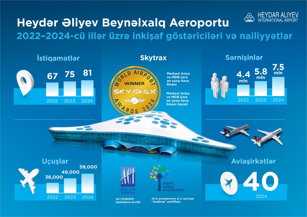 Heydər Əliyev Beynəlxalq Aeroportu üzrə də müsbət dinamika müşahidə olunur. Xidmət göstərilən istiqamətlərin sayı 2022-ci ilə nəzərən 67-dən 2024-cü ilin göstəricilərinə əsasən 81-ə yüksəlib, sərnişin sayı isə eyni illə müqayisədə 4,4 milyondan 2024-də 7,5 milyona qədər artıb.