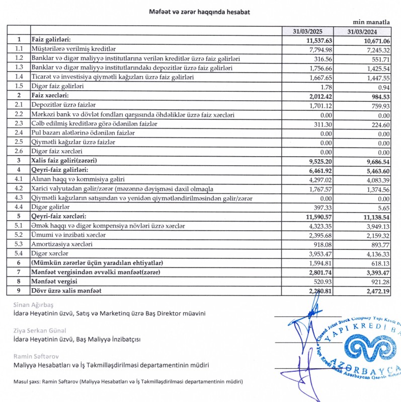 2025-ci ilin ilk rübündə "Yapı Kredi Bank Azərbaycan"nın cəmi əməliyyat gəlirləri (faiz və qeyri-faiz gəlirləri) 1 milyon 866 min manat, cəmi əməliyyat xərcləri (faiz və qeyri faiz xərcləri) 1 milyon 480 min manat artıb. Gəlirlərdəki artım xərclərdəki artımdan daha yüksək məbləğdə olduğu üçün Bankın əməliyyat mənfəəti artıb. Lakin mümkün zərərlər üzrə yaradılan ehtiyatlara ayrılan məbləğ 2,6 dəfə artaraq 1 milyon 595 min manata yüksəldiyindən "Yapı Kredi Bank Azərbaycan"nın xalis mənfəəti düşüb.