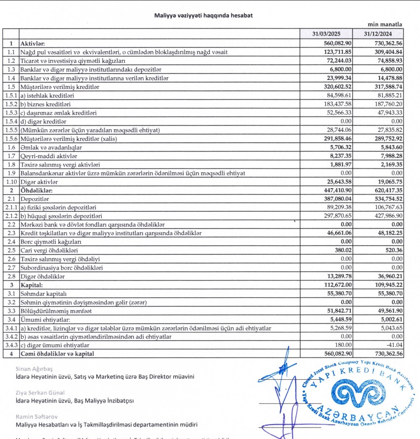 "Yapı Kredi Bank Azərbaycan"ın kredit portfeli (müştrilərə verilmiş kreditlər) 2025-ci ilin 1-ci rübündə ötən ilin sonu ilə müqayisədə 3 milyon 13 min manat və ya 1%-ə yaxın artaraq 31 Mart 2025-ci il tarixində 320 milyon 602 min manata çatıb.