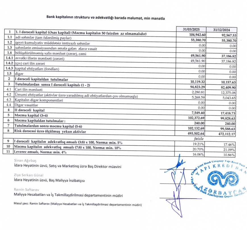 2025-ci ilin ilk rübündə "Yapı Kredi Bank Azərbaycan"ın məcmu kapitalı 2 milyon 544 min manat artıb və 31 Mart 2025-ci il tarixində 102 milyon 133 min manata çatıb. Bank 2024-cü ilin sonunda 99 milyon 589 min manat məcmu kapitala malik idi.