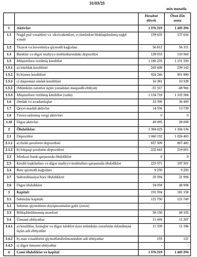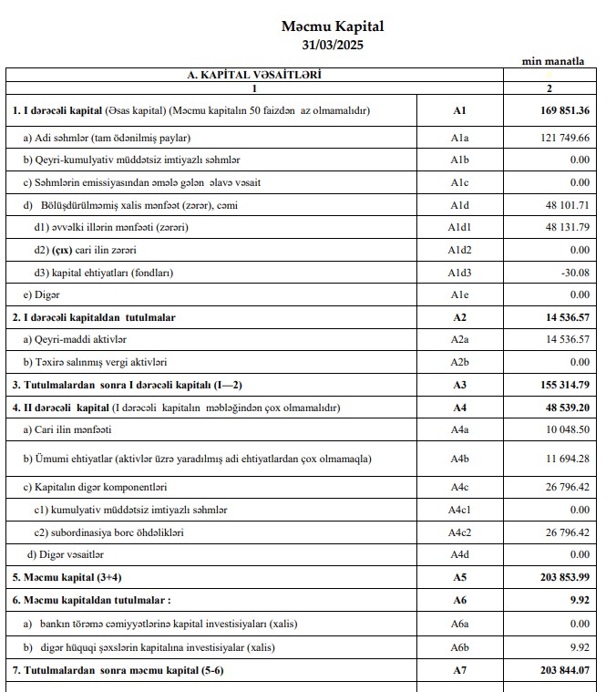 - 2025-ci ilin 1-ci rübü ərzində Bankın məcmu kapitalı ötən ilin analoji dövrü ilə müqayisədə 31% və ya 48.3 milyon artaraq 203.8 milyon manata yüksəlmişdir ki, bu da requlyativ tələbdən 4.1 dəfə çoxdur. Artımın əsas drayveri generasiya edilən mənfəət və xaricdən cəlb olunmuş subordinasiya olunmuş kredit borcudur.