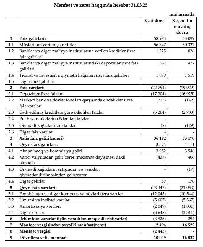 sBank 2025-ci ilin 1-ci rübündə 10 milyon manat xalis mənfəət əldə edib.Azərbaycanda mikro sahibkarlığın kreditləşməsi bazarının lideri olan AccessBank, 2025-ci ilin 1-ci rübü üzrə maliyyə nəticələrini açıqlayıb.