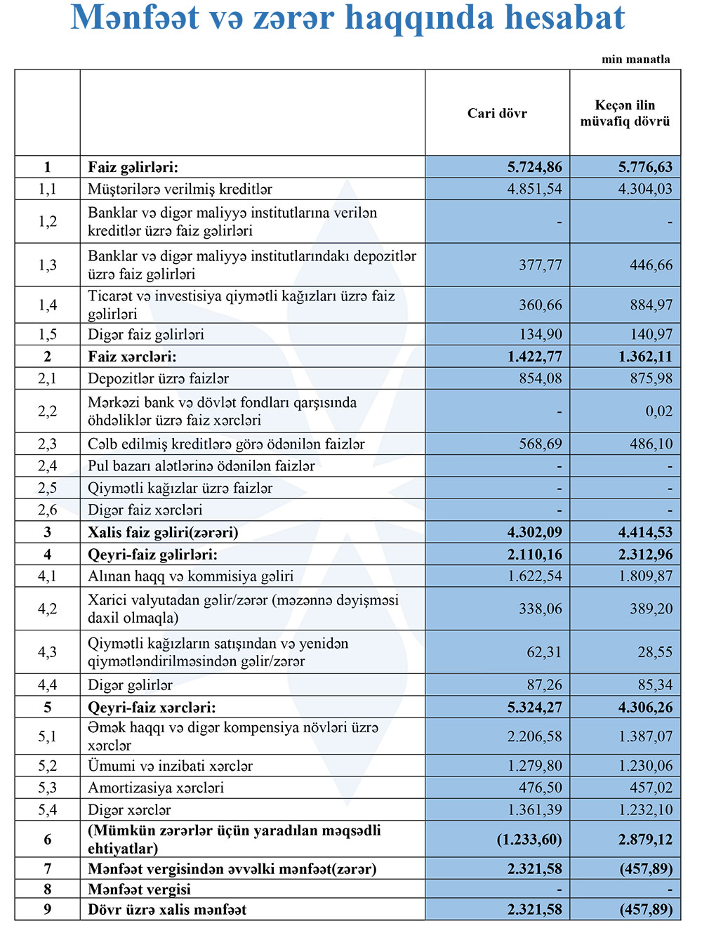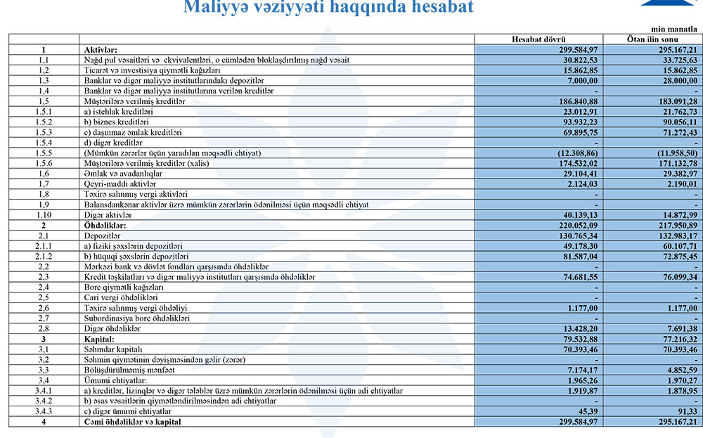 Müqayisə üçün qeyd edək ki, 2024-cü ilin ilk rübündə "AFB Bank" 2 milyon 422 min manat əməliyyat mənfəəti əldə etməsinə baxmayaraq, 2 milyon 879 min manat mümkün zərərlər üçün yaradılan məqsədli ehtiyatlara ayırdığı üçün həmin dövürü 458 min manat zərər ilə bağlamışdı.