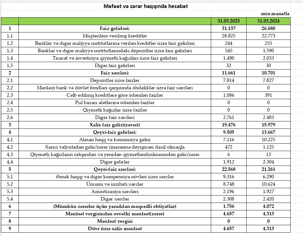 "Rabitəbank" ASC 2025-ci ilin 1-ci rübünü (yanvar-mart) 4 milyon 657 min manat xalis mənfəət ilə başa vurub. Bank 2024-cü ilin eyni dövrünü 4 milyon 313 min manat xalis mənfəət ilə bağlamışdı. Beləliklə, "Rabitəbank"ın xalis mənfəəti 2025-ci ilin 1-ci rübündə 2024-cü ilin 1-ci rübü ilə müqayisədə 344 min manat və ya 8% artıb. Xalis mənfəətin artması mümkün zərərlər üçün yardılan məqsədli ehtiyatlara ayrılan vəsaitin azalmasından qaynaqlanır. Bankın cari fəaliyyətinin nəticəsini daha dəqiq göstərən əməliyyat mənfəəti azalıb.