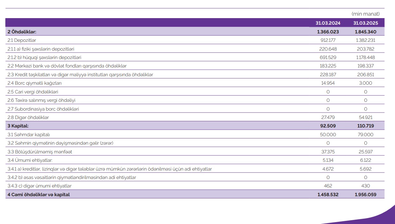 Cəmi bank öhdəliklərinin həcmi 35% artımla 1,9 milyard manat səviyyəsindədir.