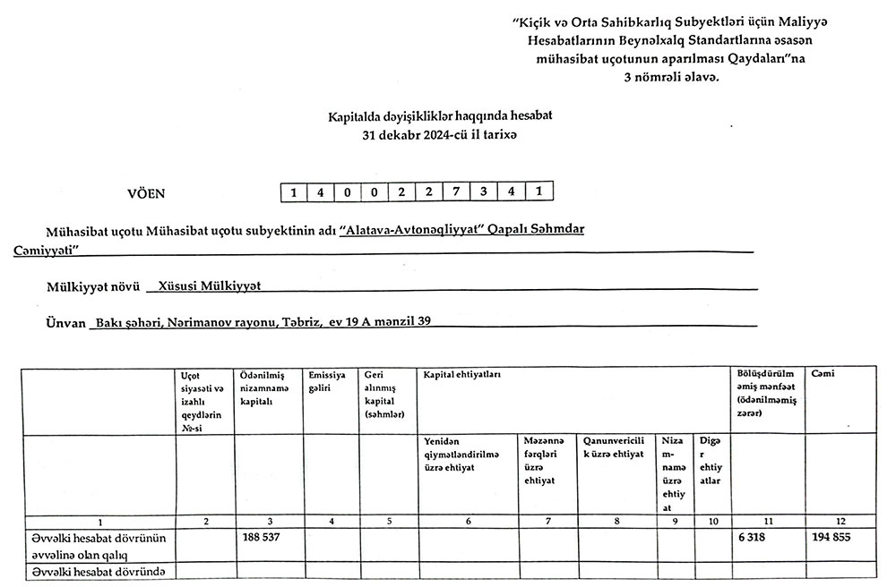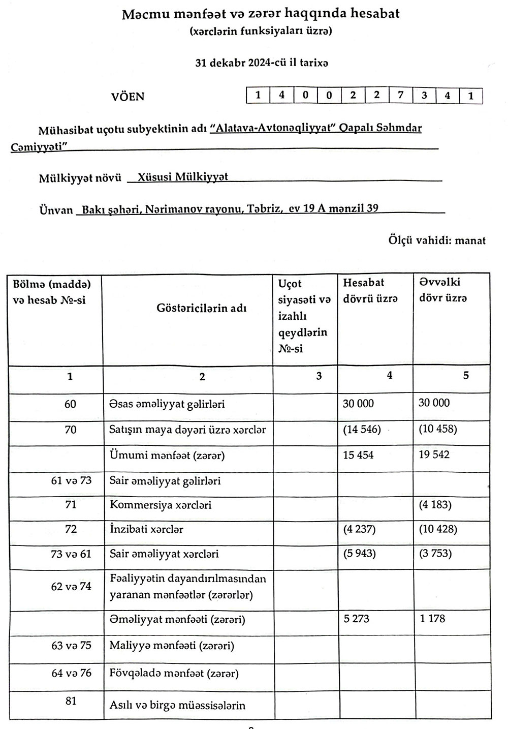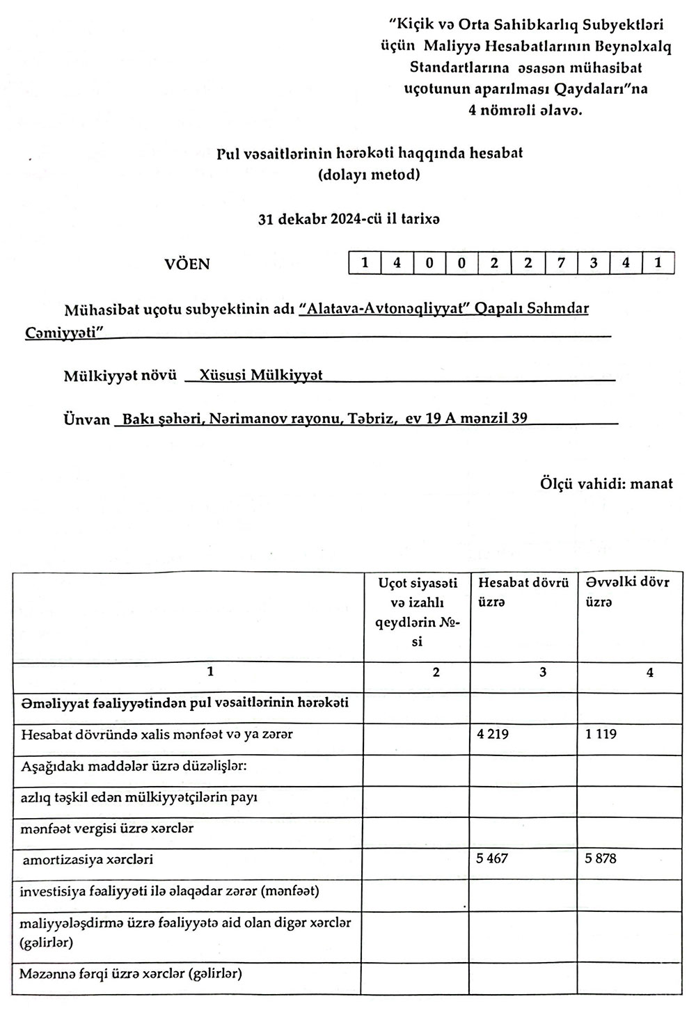"Alatava-Avtonəqliyyat" QSC-nin 31 dekabr 2024-cü il tarixində başa çatan il üzrə maliyyə hesabatları.