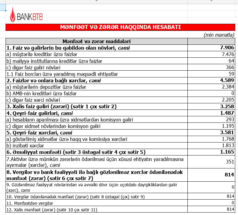 "Bank BTB" 2025-ci ilin 1-ci rübünü (yanvar-mart) 814 min manat xalis mənfəət ilə başa vurub. Bank 2024-cü ilin 1-ci rübünü 129 min manat xalis mənfəət ilə bağlamışdı.