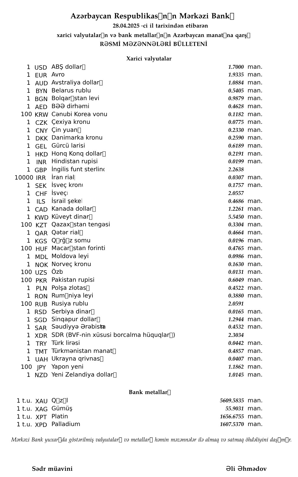 Dolların bazar ertəsi üçün rəsmi məzənnəsi müəyyən olunub