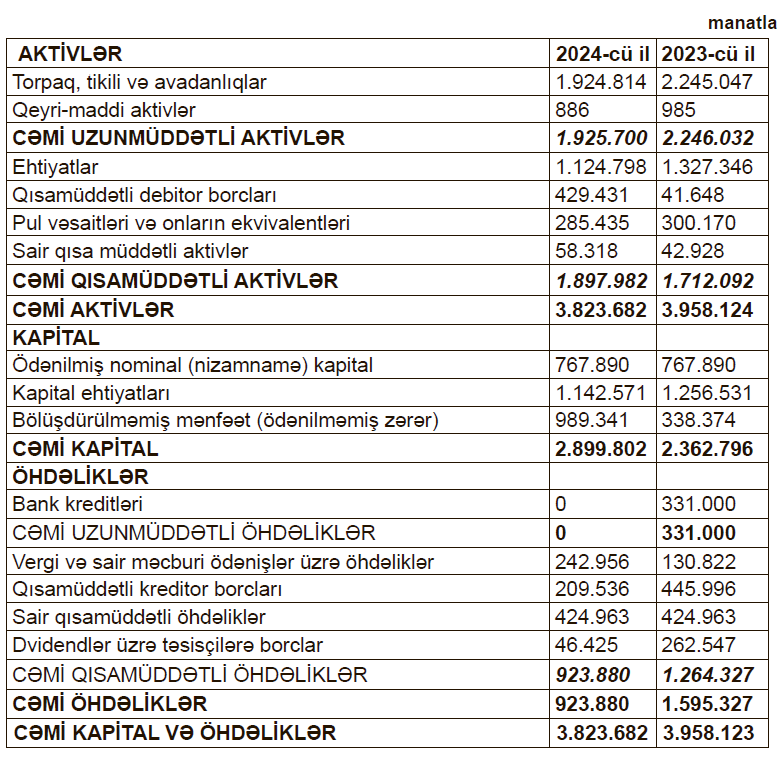 Marja.az “Neftqazmaş” ASC-nin 2024-cü il dekabrın 31-nə mühasibat balansına istinadən xəbər verir ki, ötən il şirkət 331 min manatlıq kredit borcunu tamamilə bağlayıb.