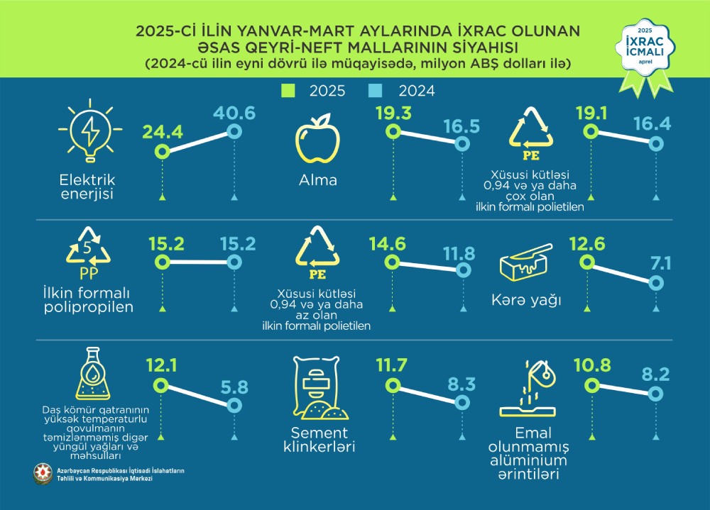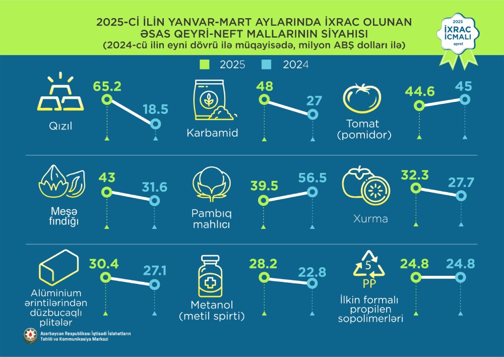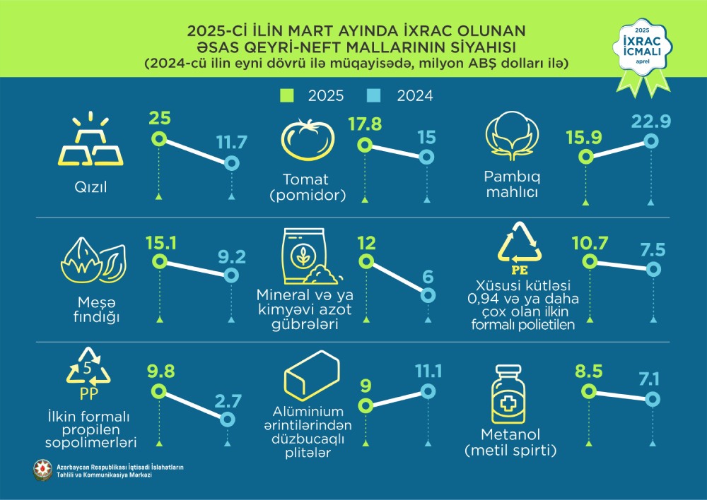 2025-ci ilin mart ayı ərzində ixrac edilmiş qeyri-neft sektoruna aid malların siyahısında qızıl (25 milyon ABŞ dolları) birinci olub. Bu siyahıda pomidor (tomat) (17.8 milyon ABŞ dolları) ikinci, pambıq (15,9 milyon ABŞ dolları) isə üçüncü yerdə qərarlaşıb.